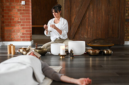Das Soundbath (Klangwellenbad) wirkt sich positiv auf dein Wohlbefinden aus. Die Praxis der Heilung durch Klänge ist mehrere tausend Jahre alt und fest im Yoga verankert. Die Instrumente erzeugen tiefe, resonierende Schwingungen, wobei die Entschleunigung der Gehirnaktivität im Vordergrund steht. Beim Soundbath wechselt das Gehirn von einem aktiven Beta- in einen tief entspannten Alpha-Zustand. Das Ergebnis für den Körper ähnelt einer Massage des Tiefengewebes, das durch die vibrierenden Töne direkt berührt wird. Dies kann einen Zustand tiefer Entspannung hervorrufen und dabei helfen, Blockaden und Verspannungen zu lösen.